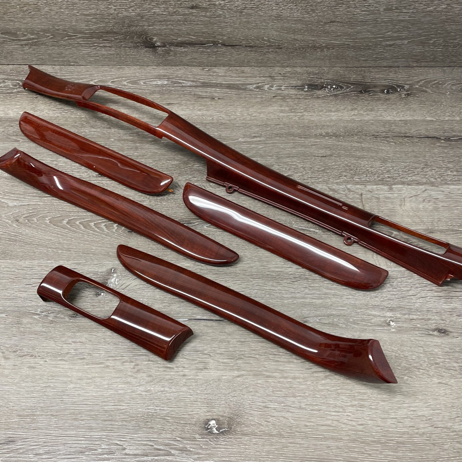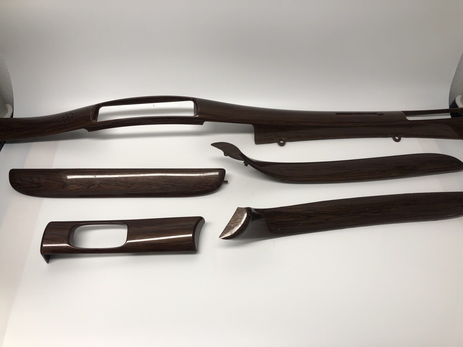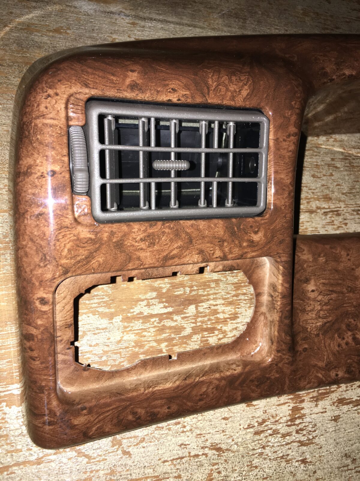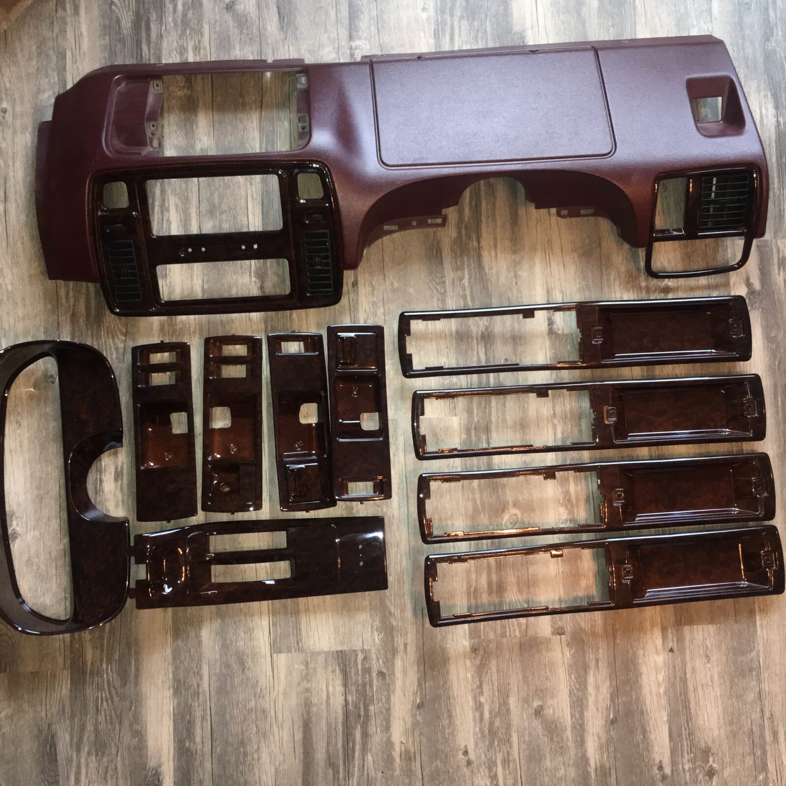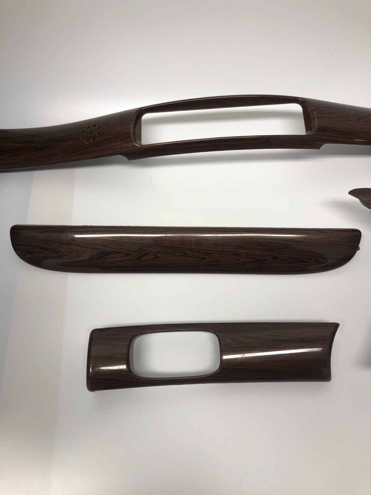 Woodgrain dash elements include all the wooden or faux wood trim pieces on your dashboard and interior trim — from center consoles, door panels, instrument clusters, bezels, and wood inlays to full dash panels. Over time, woodgrain surfaces can suffer damage from sun, heat, or age: cracks, peeling, delamination, color fading, and splintering. Our service handles all of these issues and more.