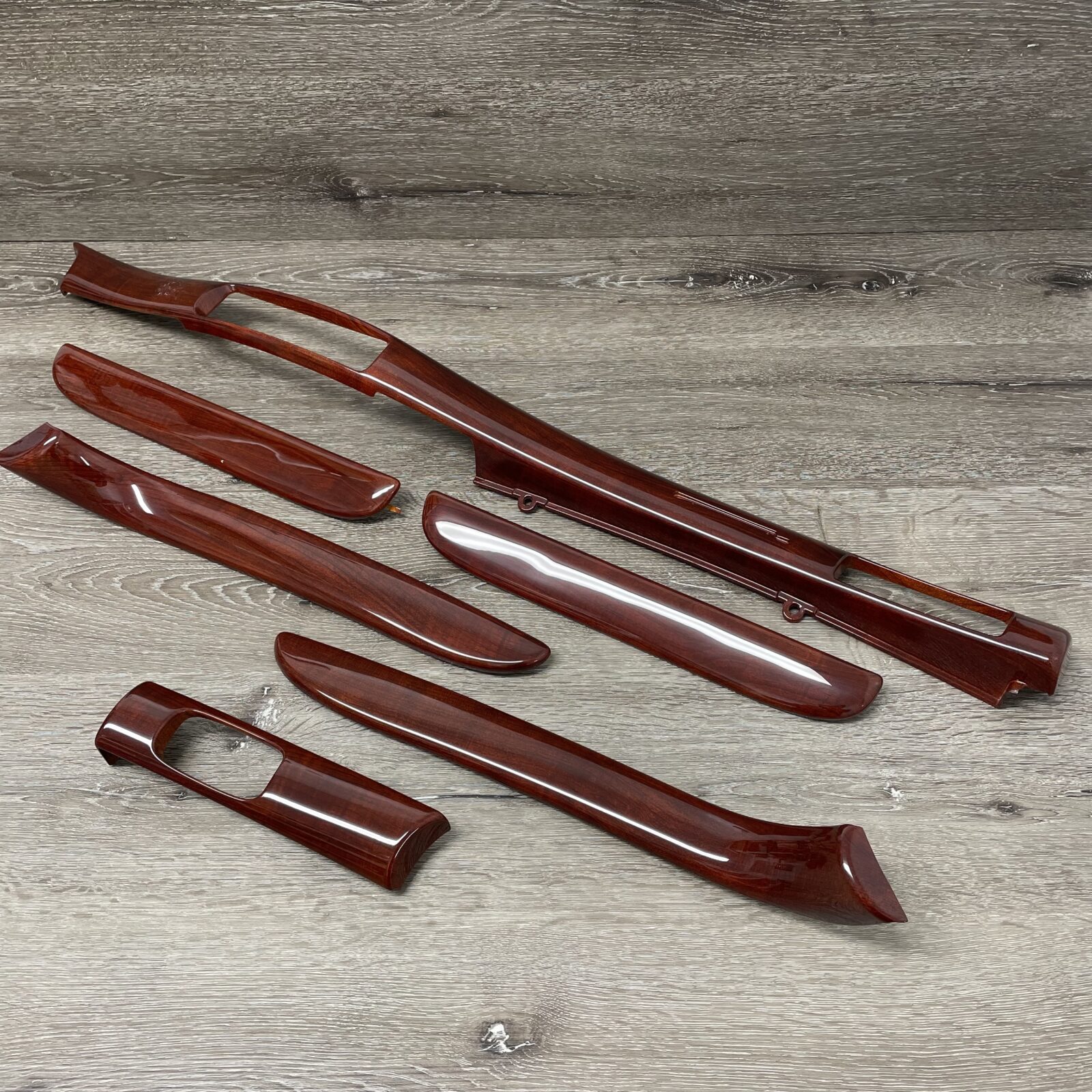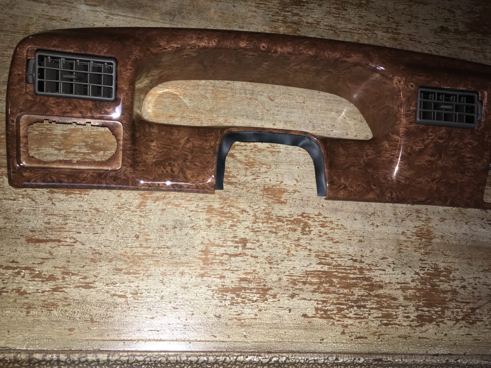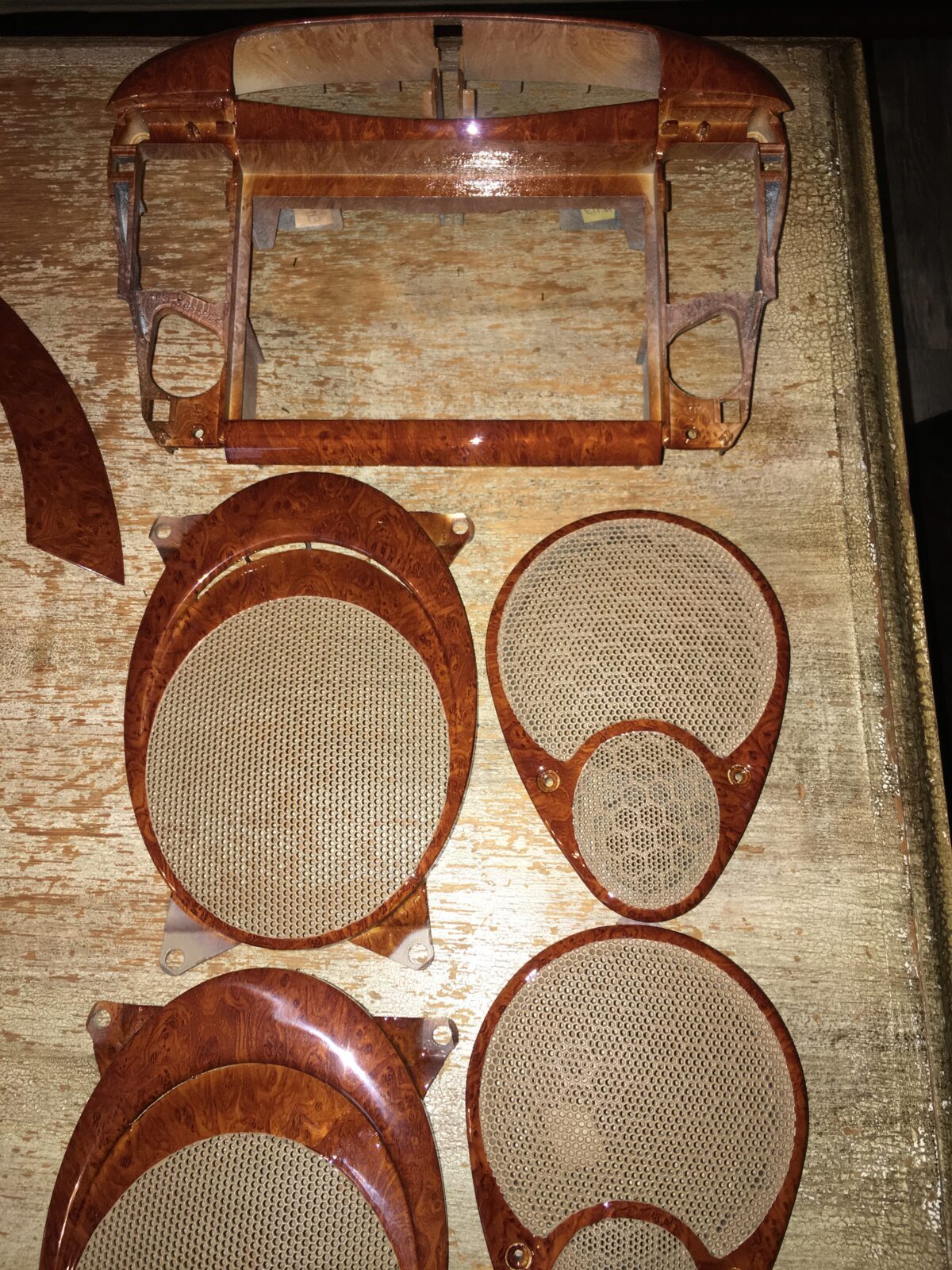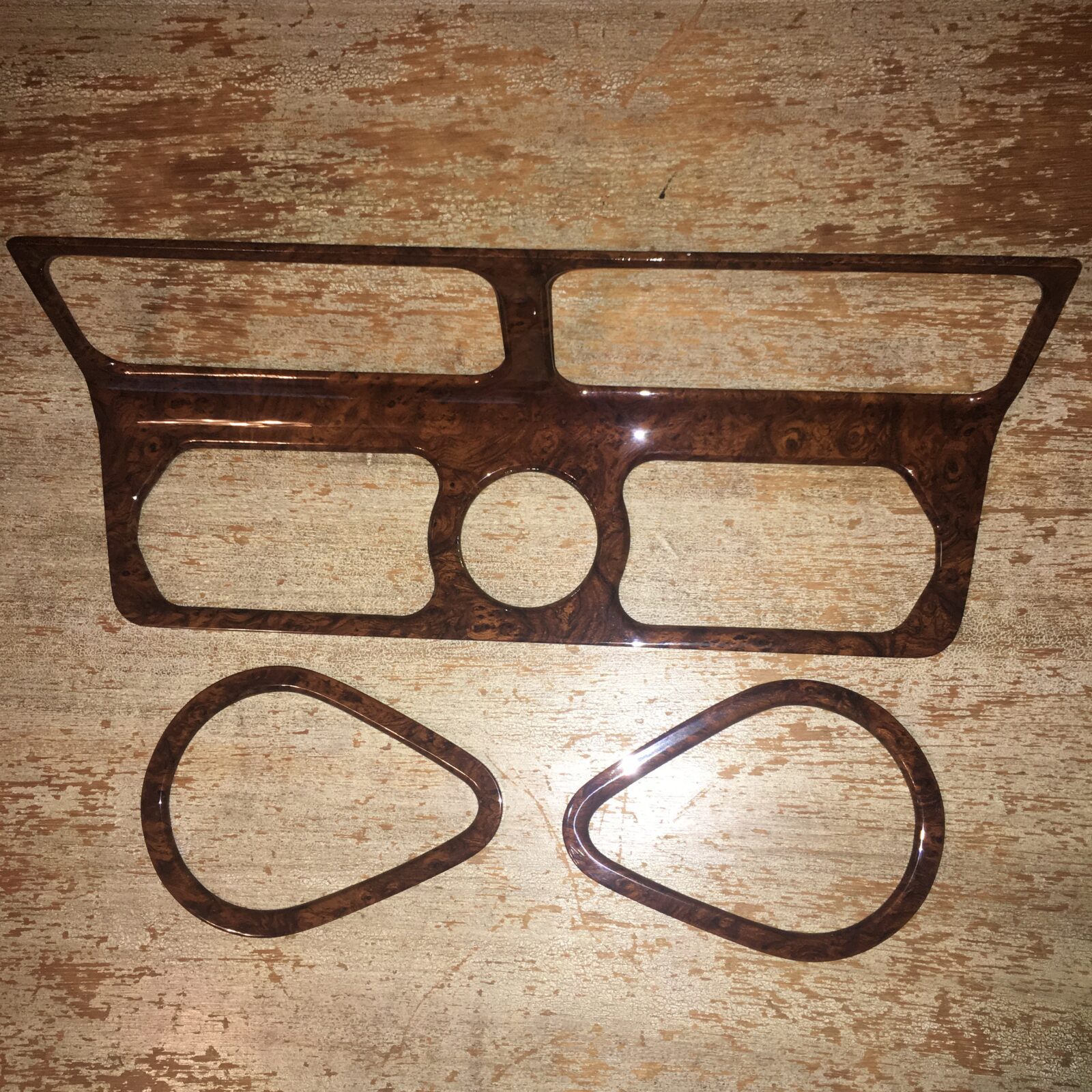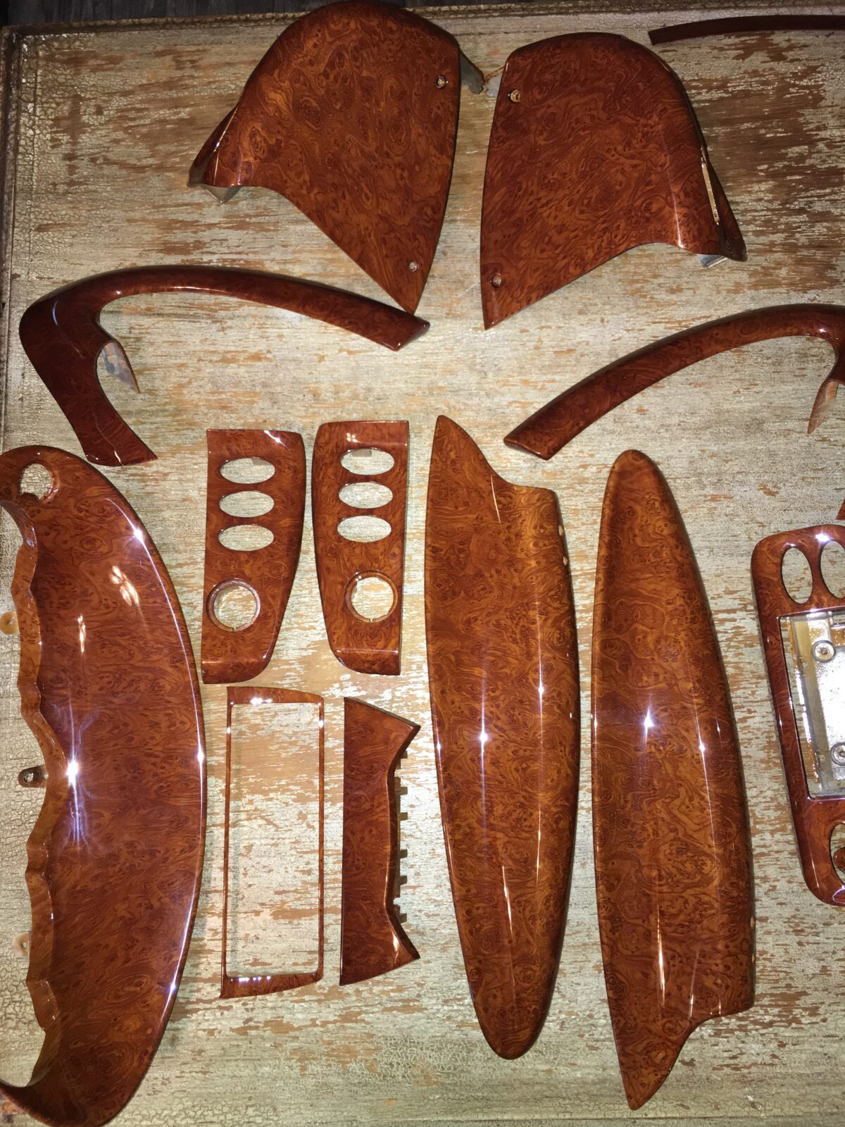 Woodgrain dash elements include all the wooden or faux wood trim pieces on your dashboard and interior trim — from center consoles, door panels, instrument clusters, bezels, and wood inlays to full dash panels. Over time, woodgrain surfaces can suffer damage from sun, heat, or age: cracks, peeling, delamination, color fading, and splintering. Our service handles all of these issues and more.