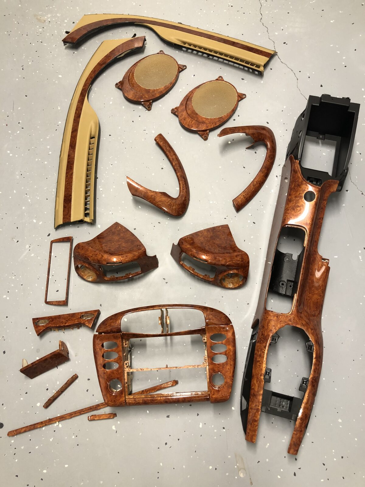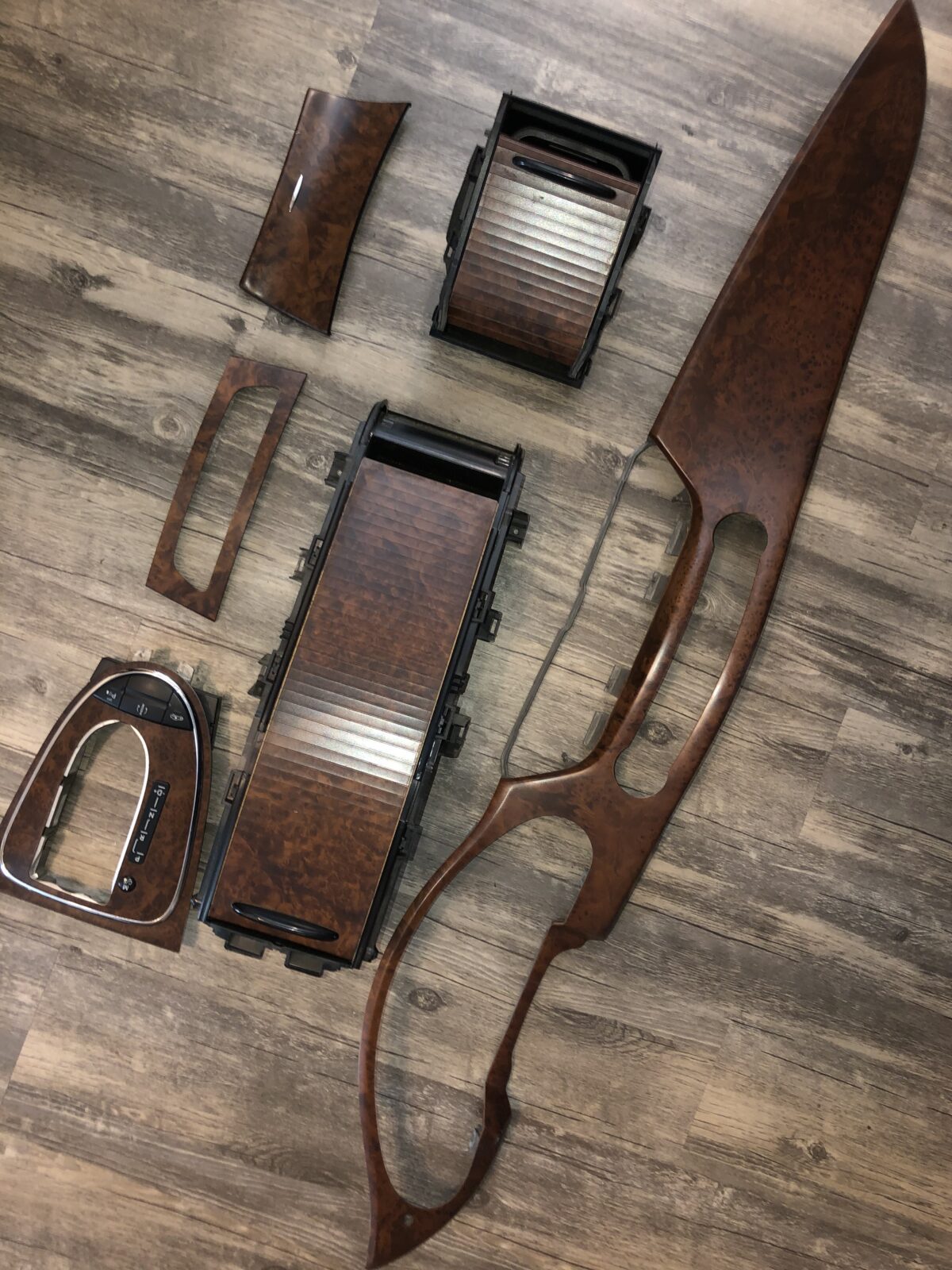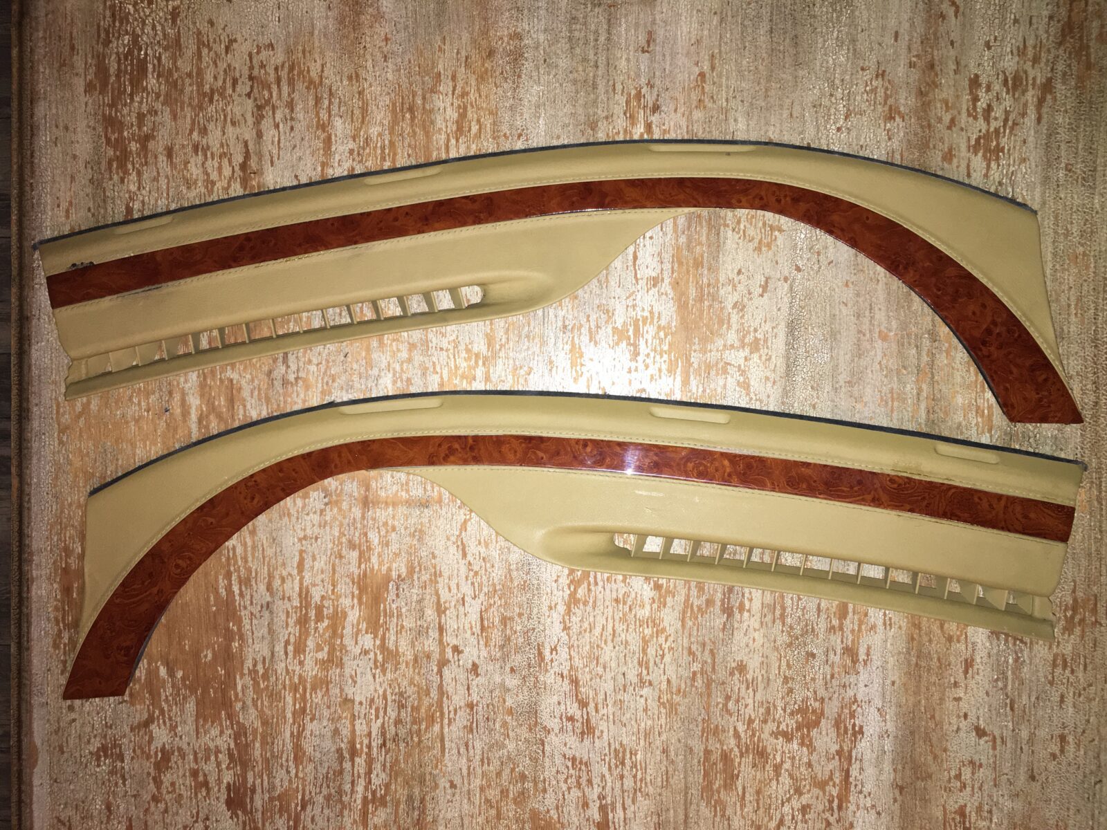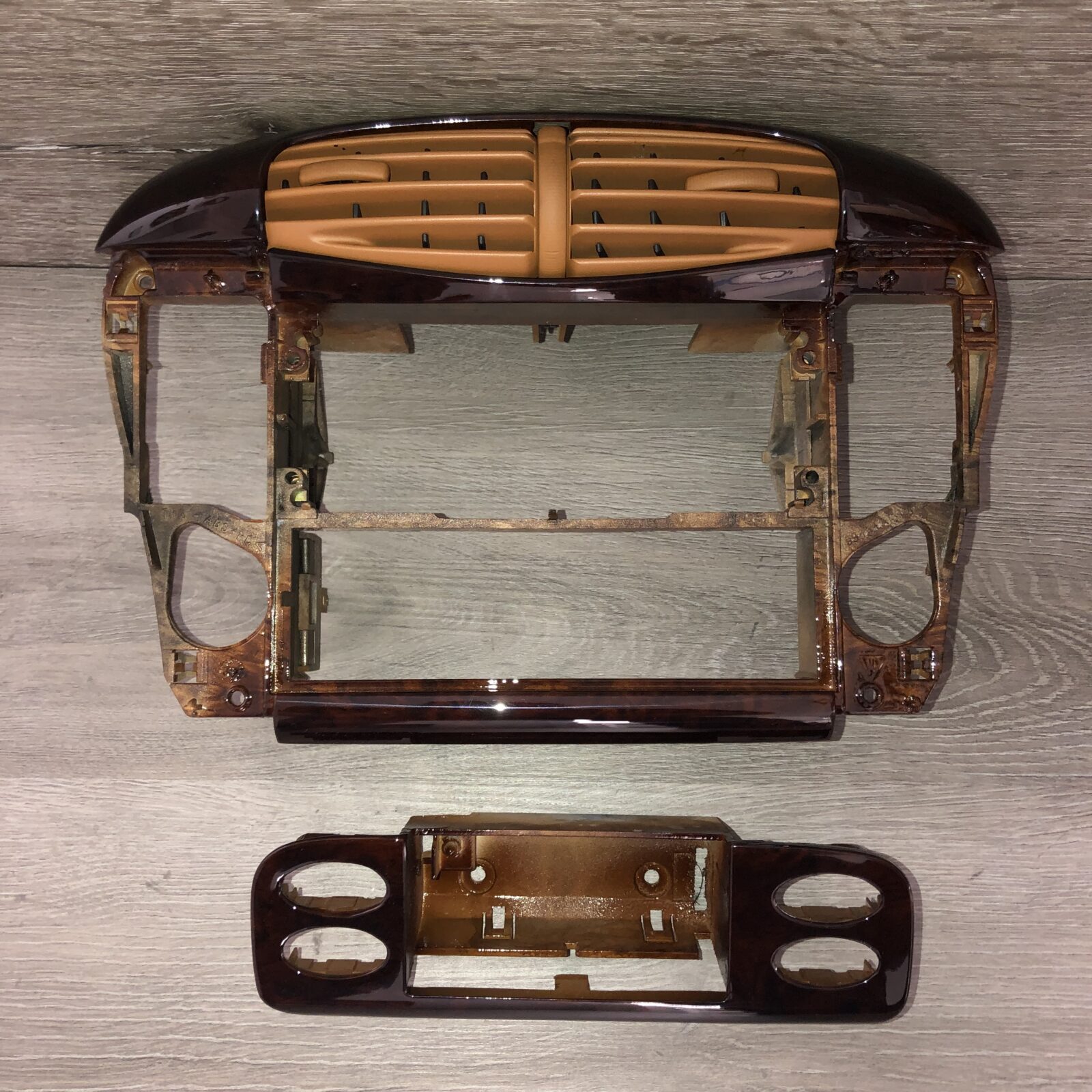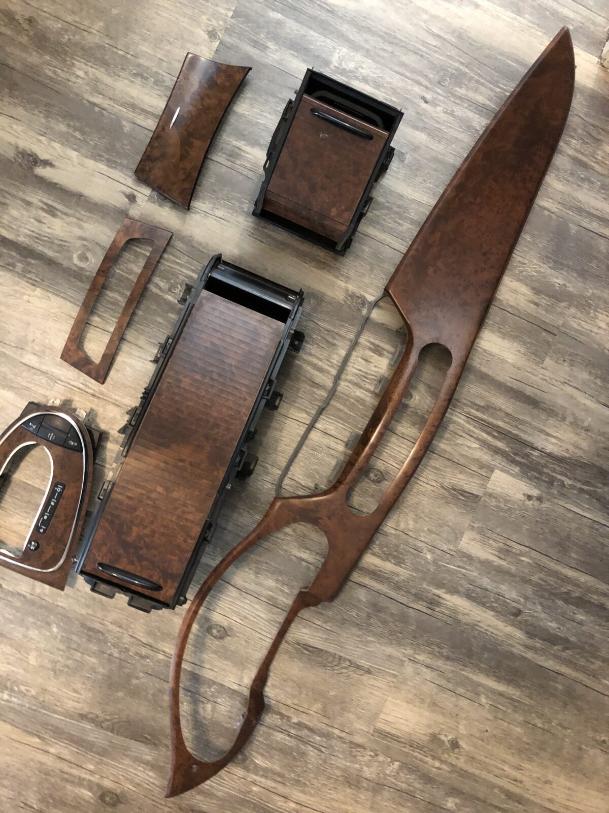 Woodgrain dash elements include all the wooden or faux wood trim pieces on your dashboard and interior trim — from center consoles, door panels, instrument clusters, bezels, and wood inlays to full dash panels. Over time, woodgrain surfaces can suffer damage from sun, heat, or age: cracks, peeling, delamination, color fading, and splintering. Our service handles all of these issues and more.