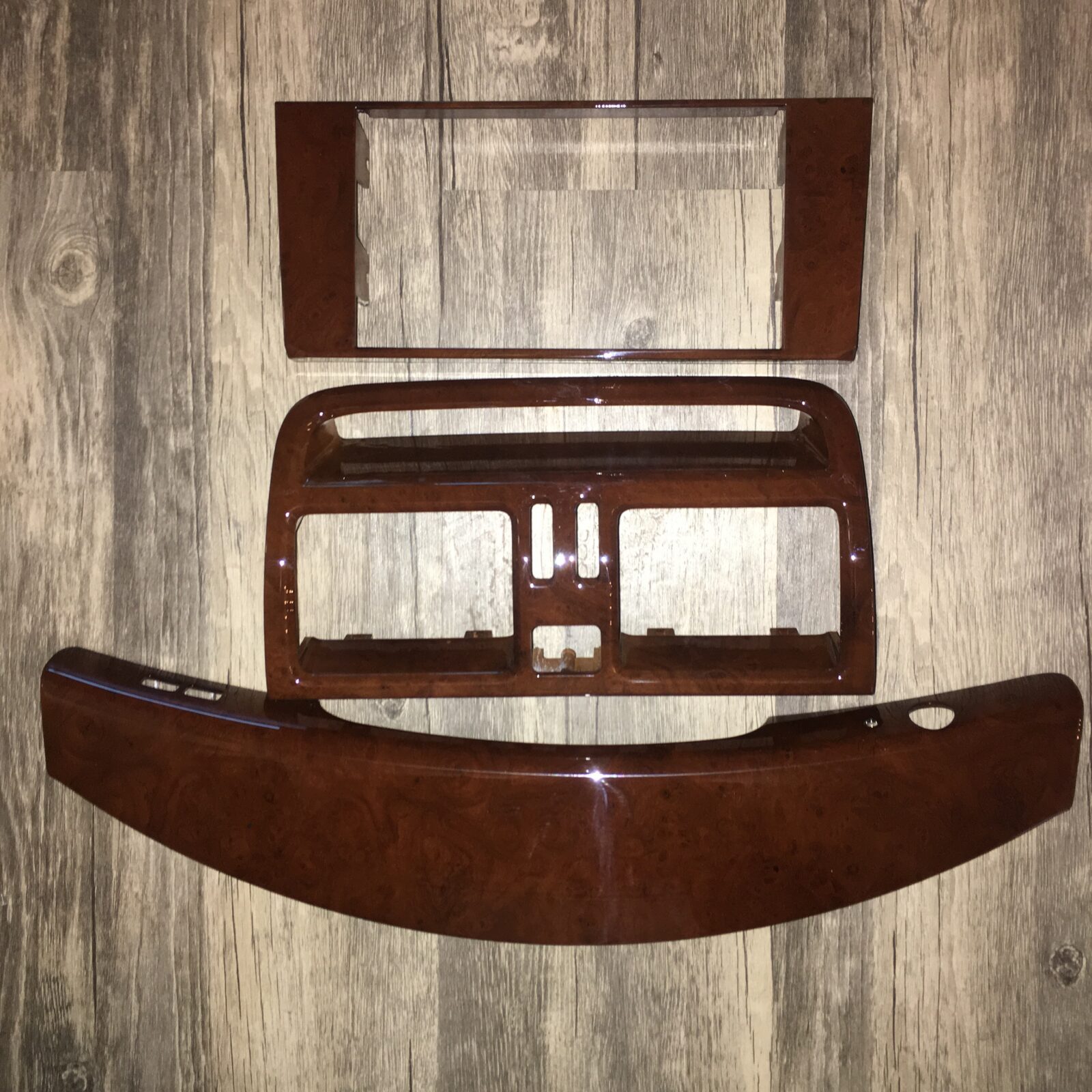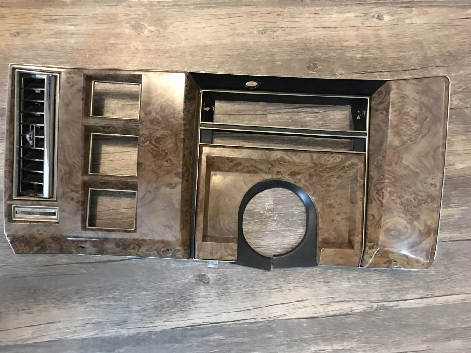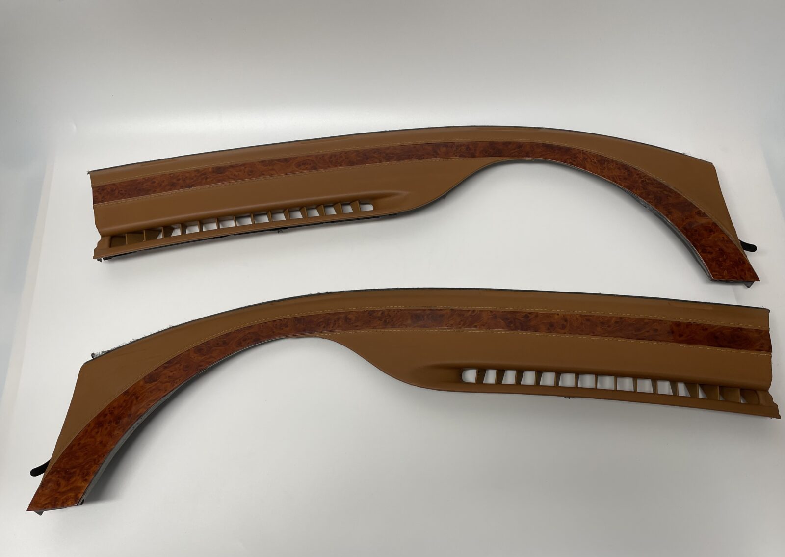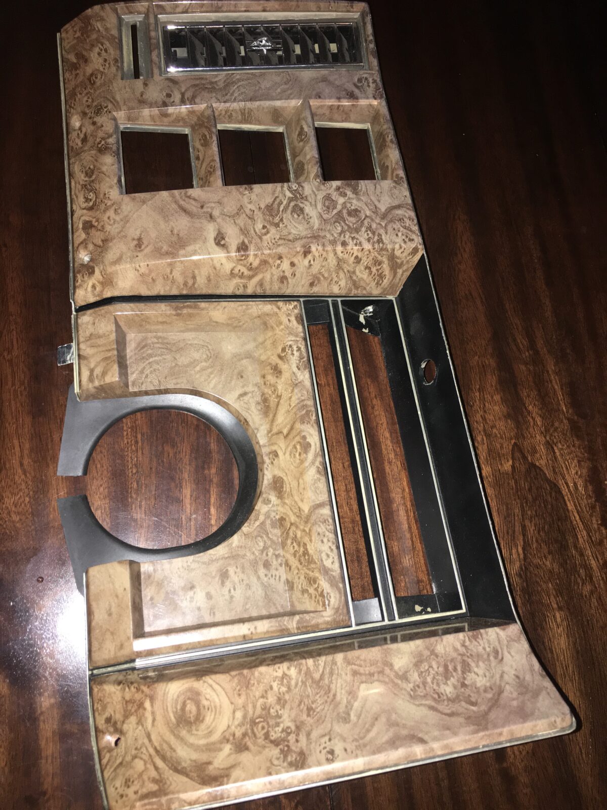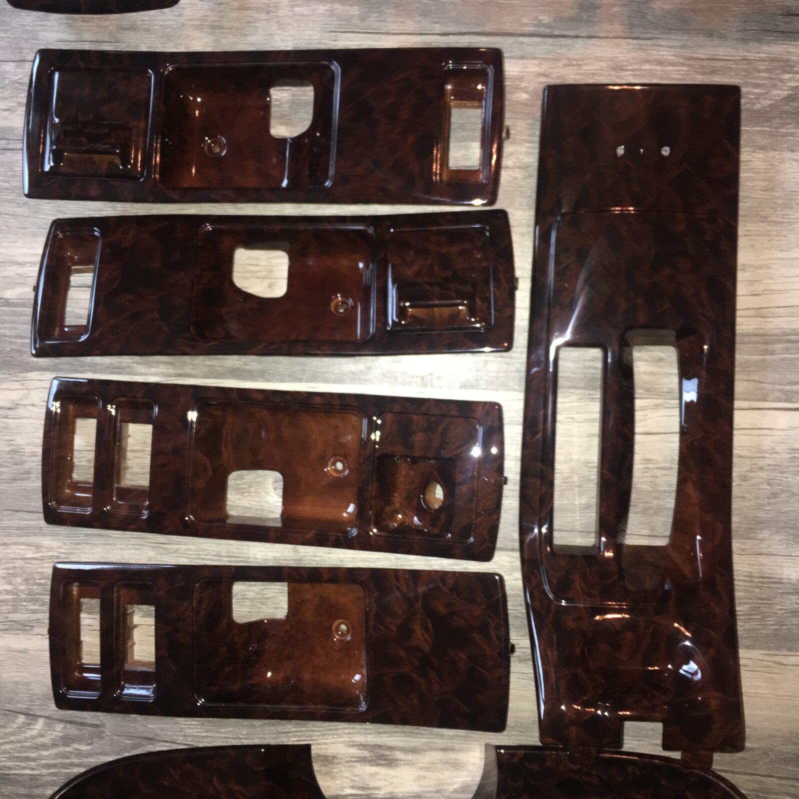 Woodgrain dash elements include all the wooden or faux wood trim pieces on your dashboard and interior trim — from center consoles, door panels, instrument clusters, bezels, and wood inlays to full dash panels. Over time, woodgrain surfaces can suffer damage from sun, heat, or age: cracks, peeling, delamination, color fading, and splintering. Our service handles all of these issues and more.