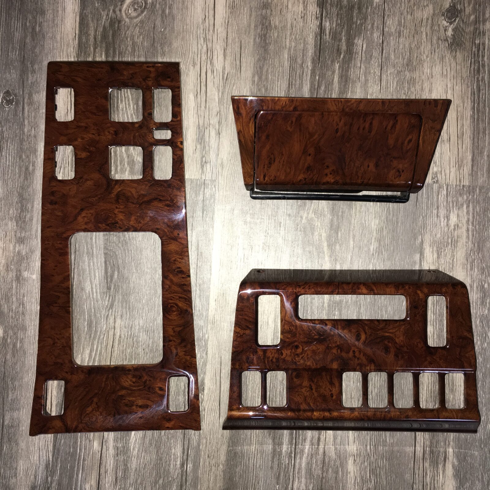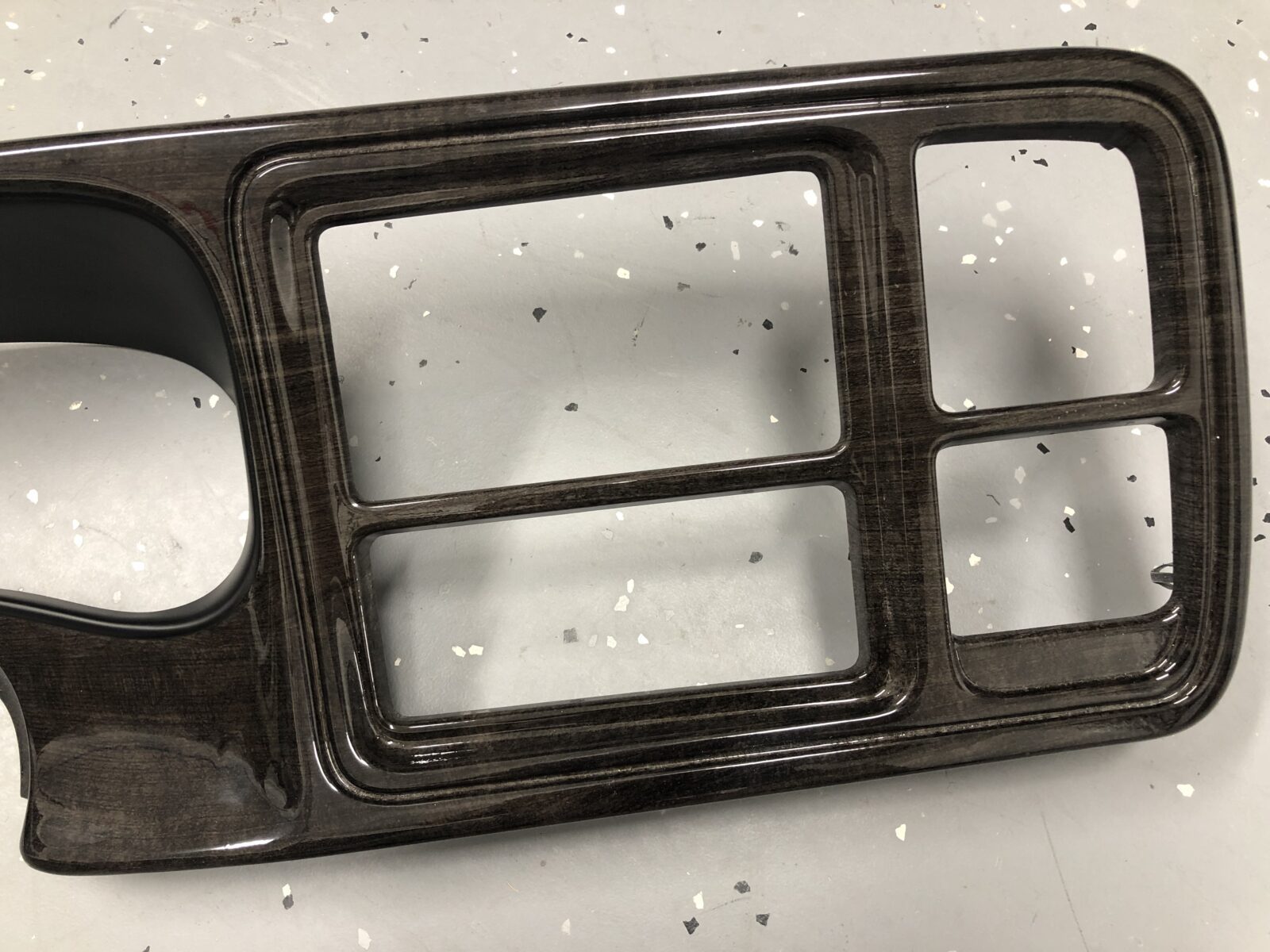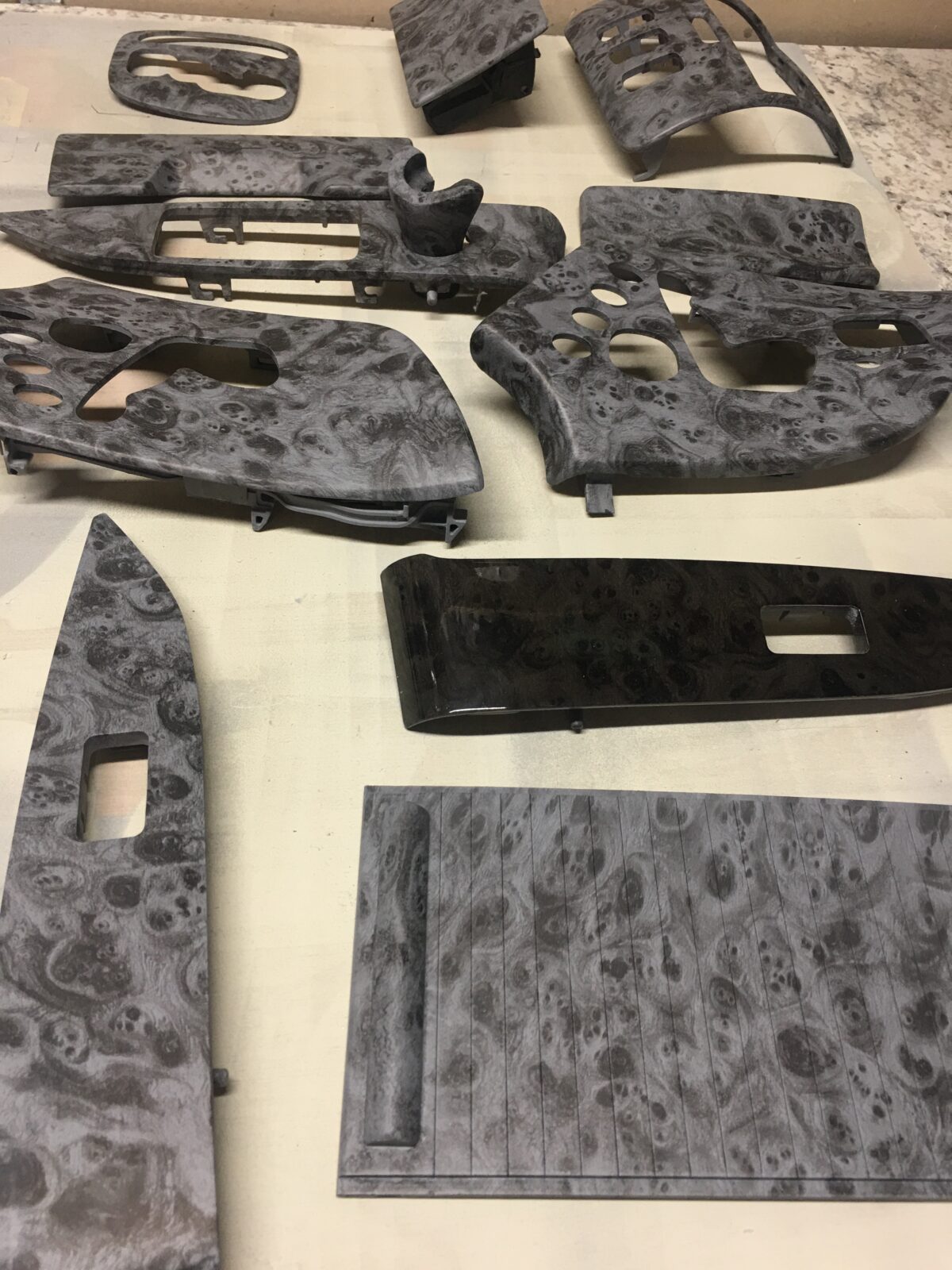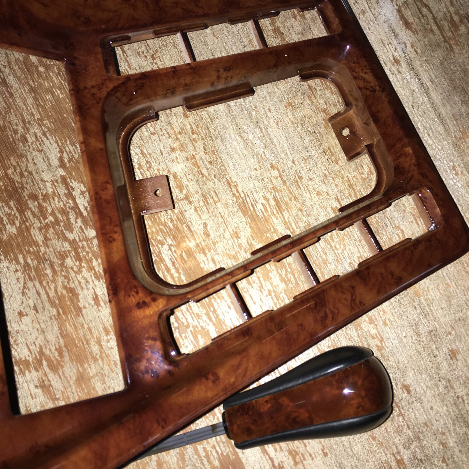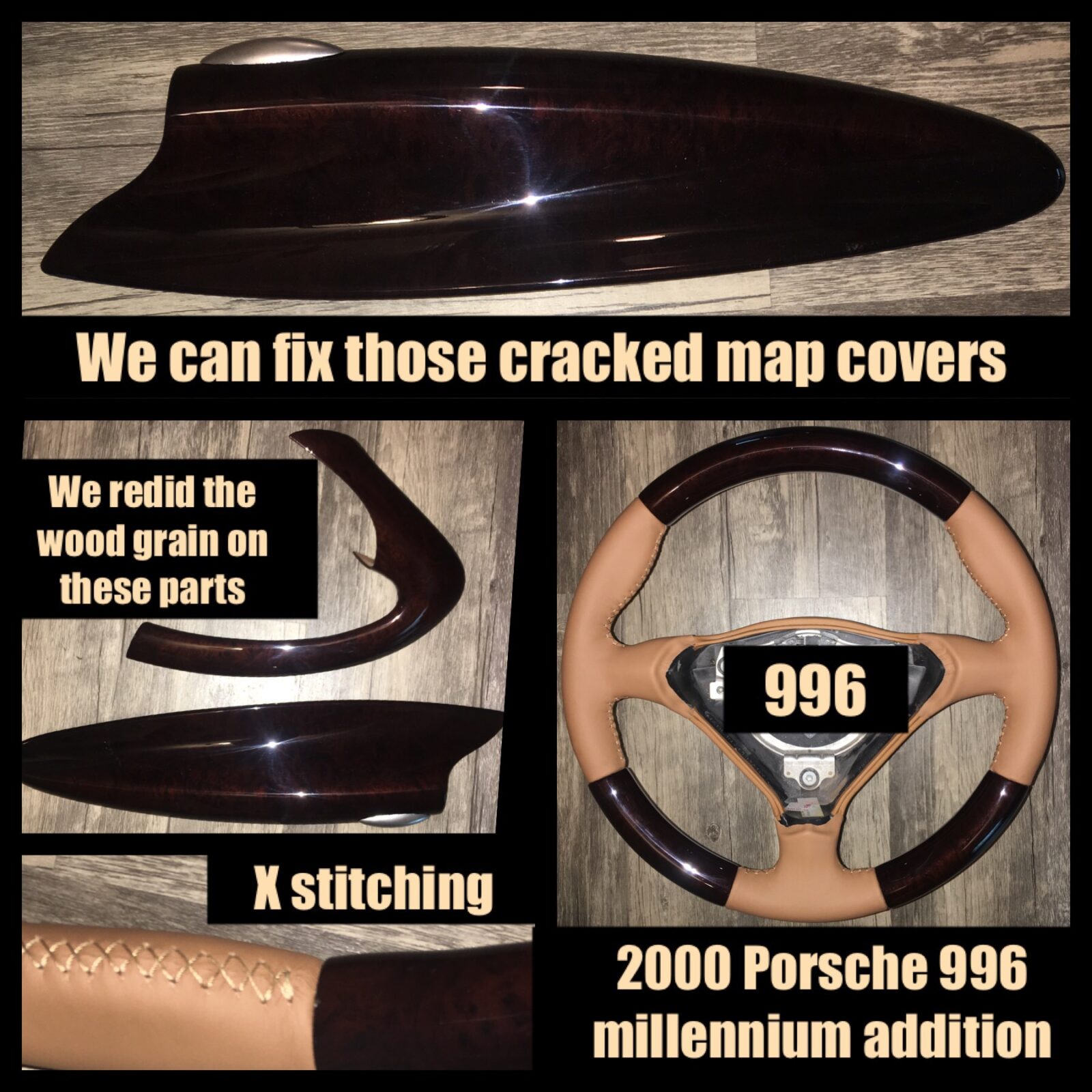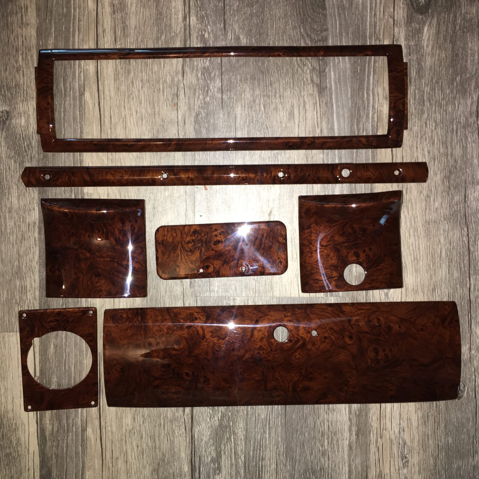 Woodgrain dash elements include all the wooden or faux wood trim pieces on your dashboard and interior trim — from center consoles, door panels, instrument clusters, bezels, and wood inlays to full dash panels. Over time, woodgrain surfaces can suffer damage from sun, heat, or age: cracks, peeling, delamination, color fading, and splintering. Our service handles all of these issues and more.
