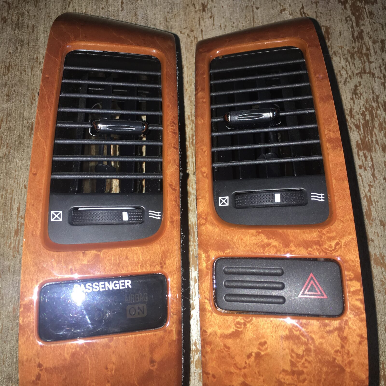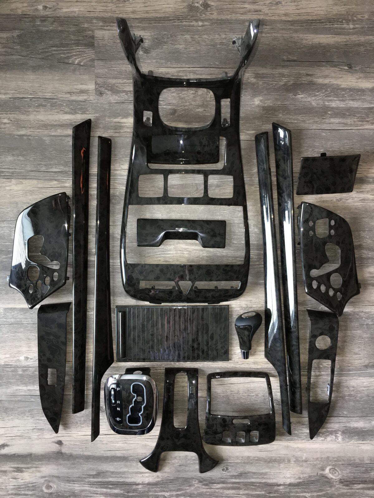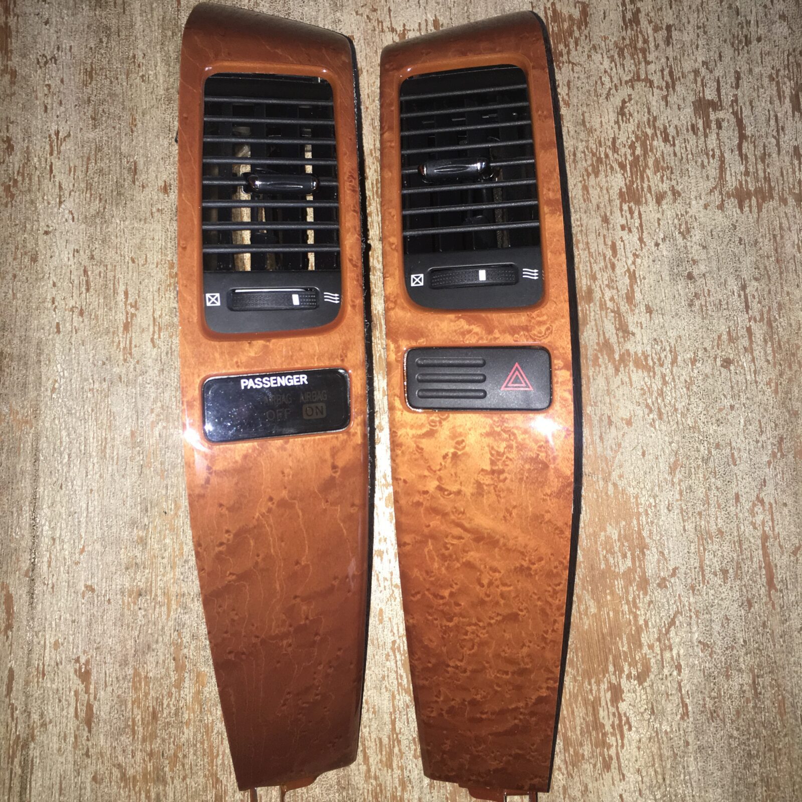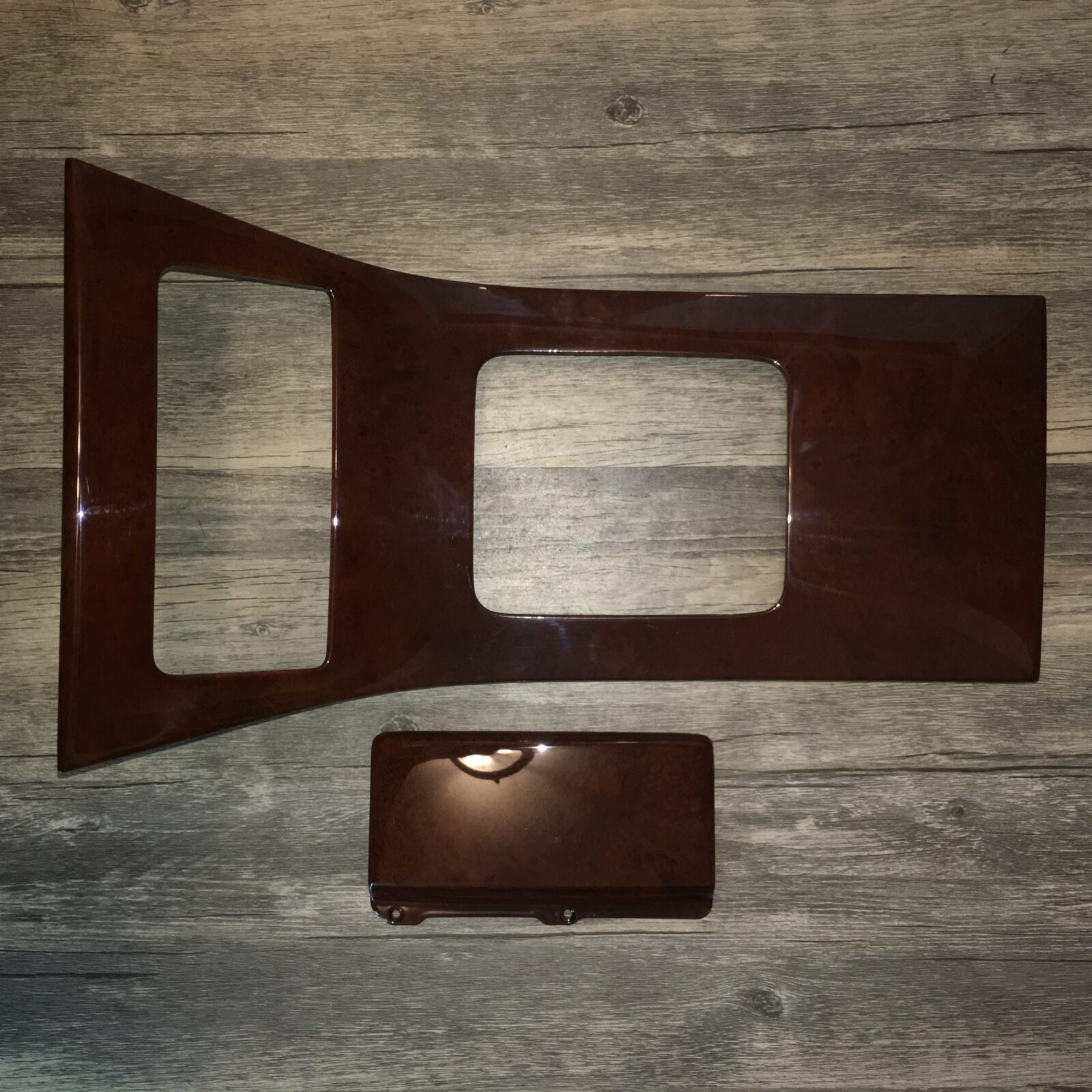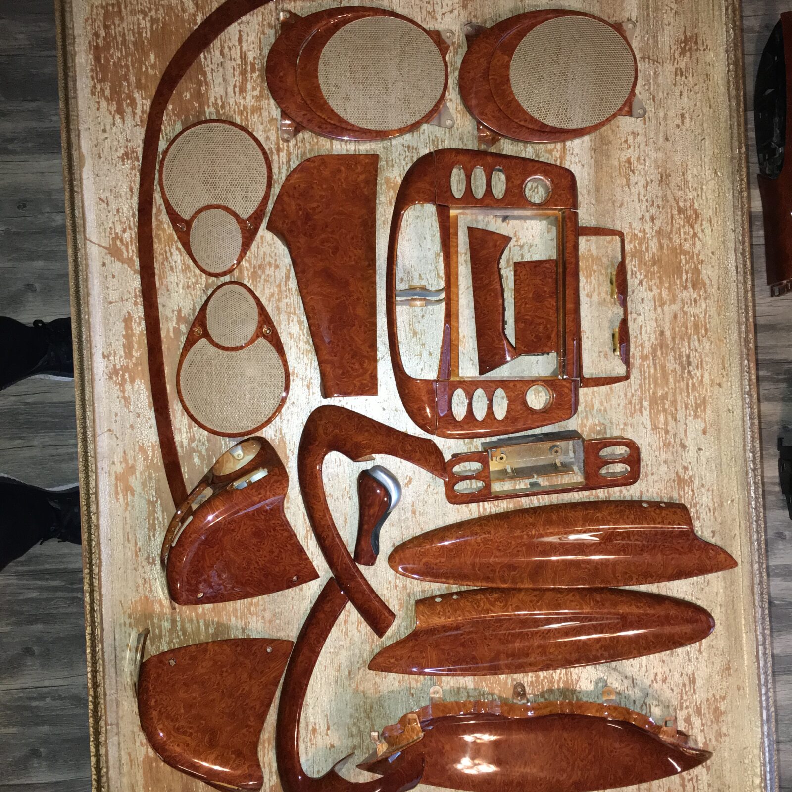 Woodgrain dash elements include all the wooden or faux wood trim pieces on your dashboard and interior trim — from center consoles, door panels, instrument clusters, bezels, and wood inlays to full dash panels. Over time, woodgrain surfaces can suffer damage from sun, heat, or age: cracks, peeling, delamination, color fading, and splintering. Our service handles all of these issues and more.